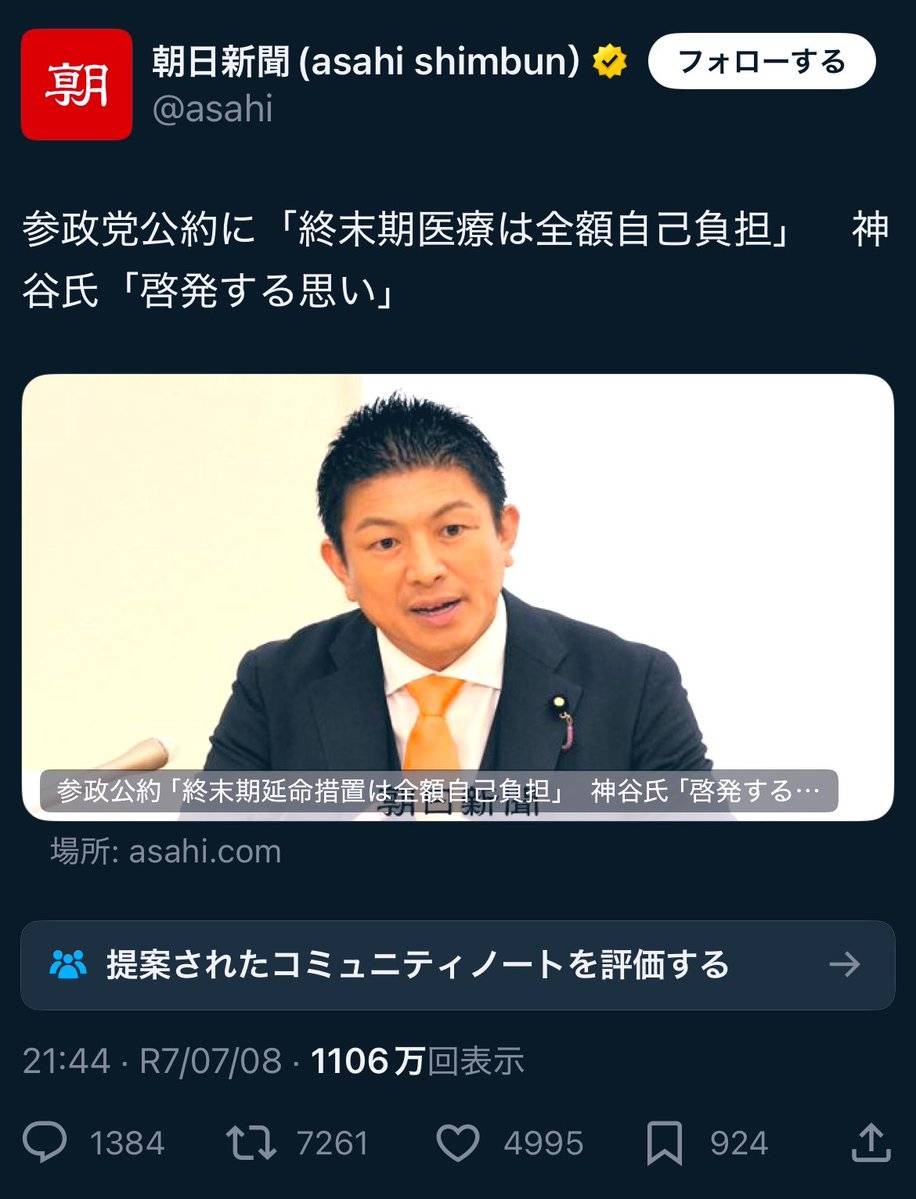 『終末期延命医療』を『終末期医療』と書き換えた投稿を朝日新聞はひっそりと削除。