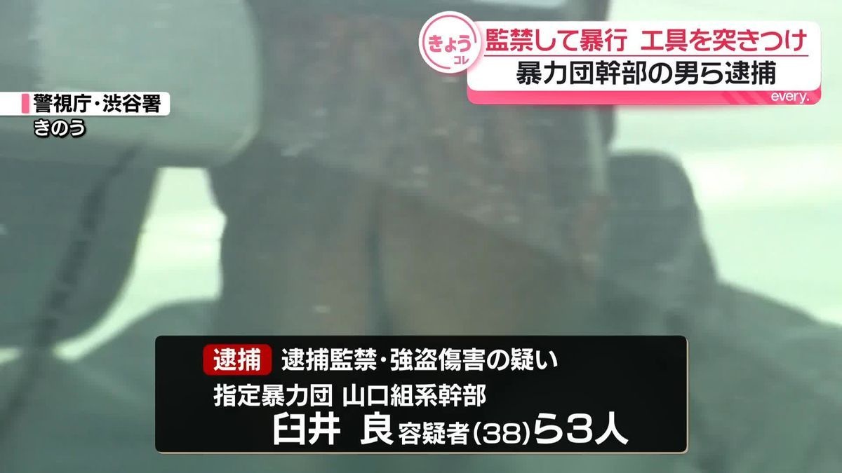 逮捕監禁と強盗致傷の疑いで逮捕されたのは、指定暴力団・六代目山口組の傘下組織「落合金町連合」の幹部、臼井良容疑者(38)、無職の勝又サードアリ容疑者(29)、配管工の武井瞬太容疑者(26)の3人です。