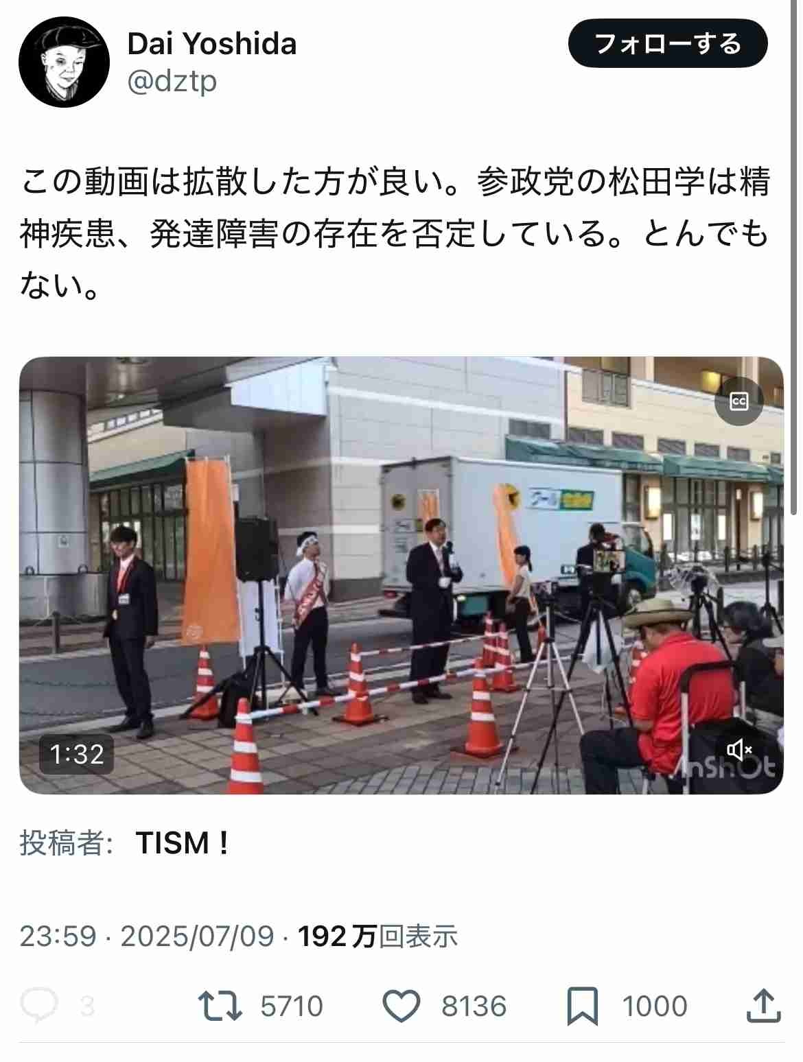 Dai Yoshida (@dztp) on Xこの動画は拡散した方が良い。参政党の松田学は精神疾患、発達障害の存在を否定している。とんでもない。x.com - 2 : 2025/07/16(水) 12:44:41.85 ID:W3Rwj7ls0