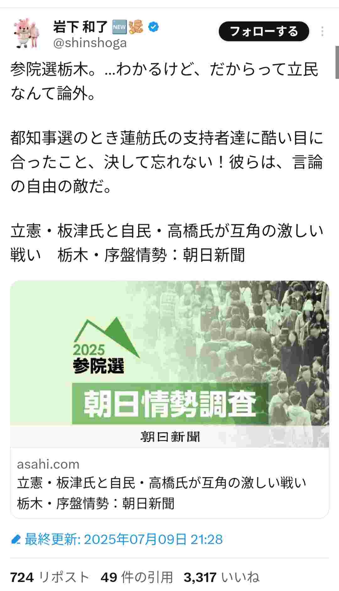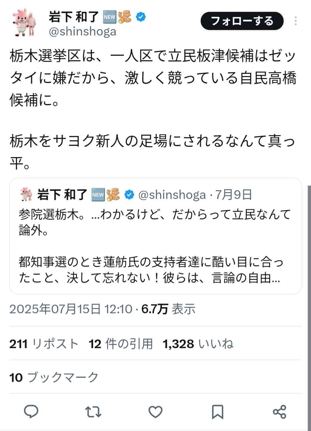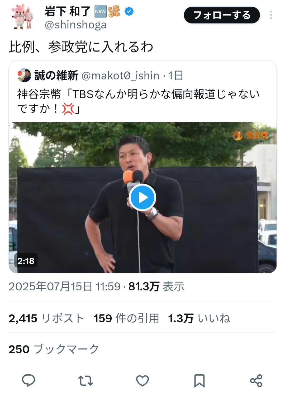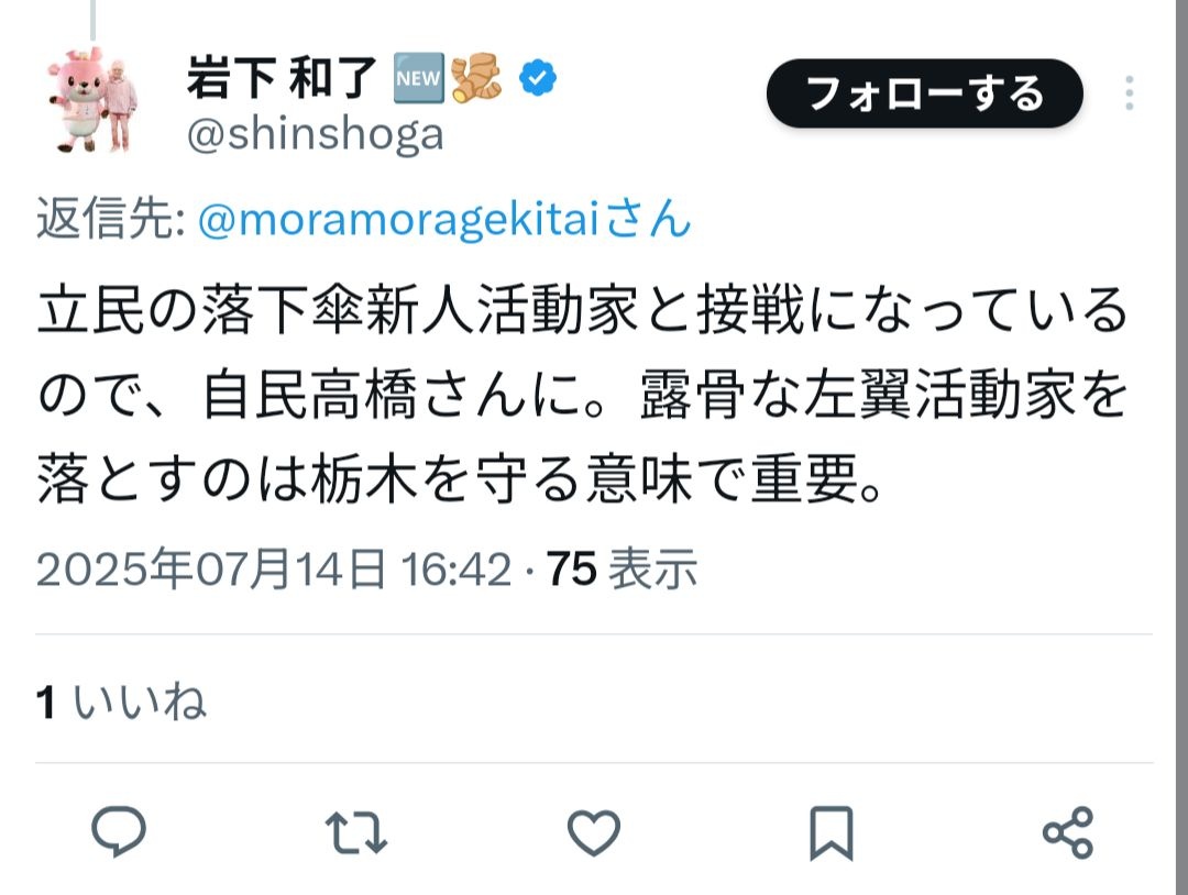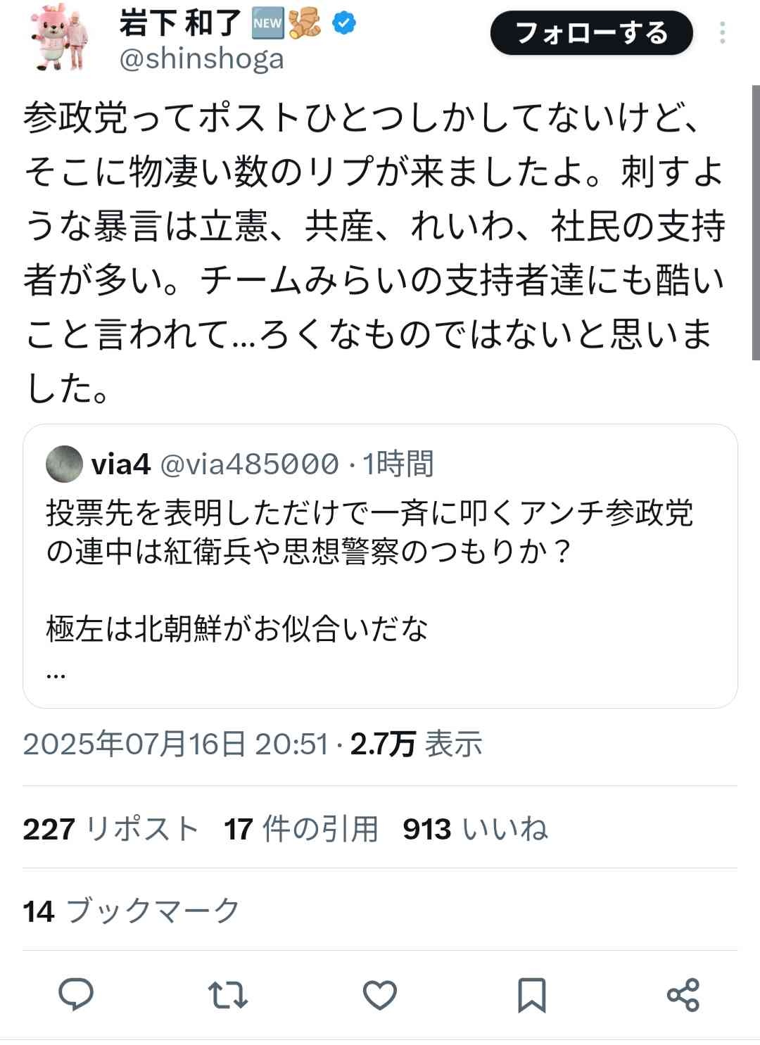 岩下の新生姜「参政党に投票すると発言したら大量に誹謗中傷された!