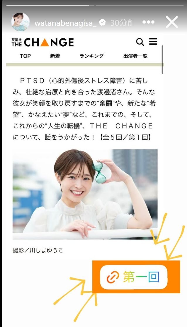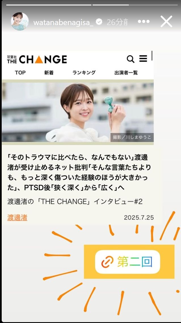 ストーリーズでも告知。PTSD(心的外傷後ストレス障害)に苦しみ、笑顔を取り戻すための奮闘についてインタビュー。他には「『そのトラウマに比べたら、なんでもない』渡邊渚が受け止めるネット批判『そんな言葉たちよりも、もっと深く傷ついた経験の方が大きかった』PTSD後『狭く深く』から『広く』へ」との見出しがついたインタビューも告知した。