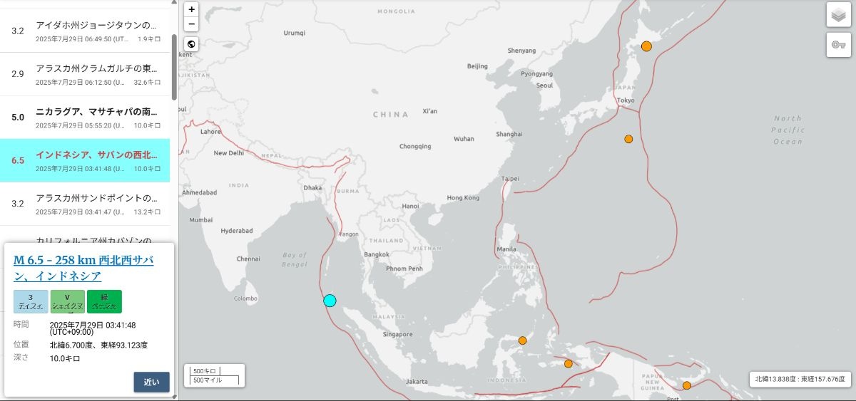 震源地:インドネシア(北緯6.7度、東経93.1度)