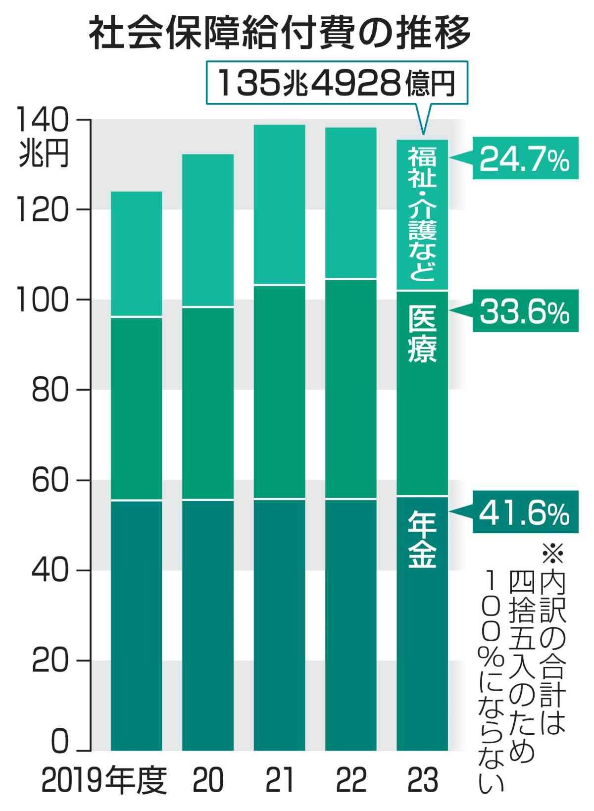 厚生労働省の国立社会保障・人口問題研究所は29日、年金や医療、福祉にかかった2023年度の社会保障給付費の総額が前年度比1.9%減の135兆4928億円だったと発表した。減少は2年連続。