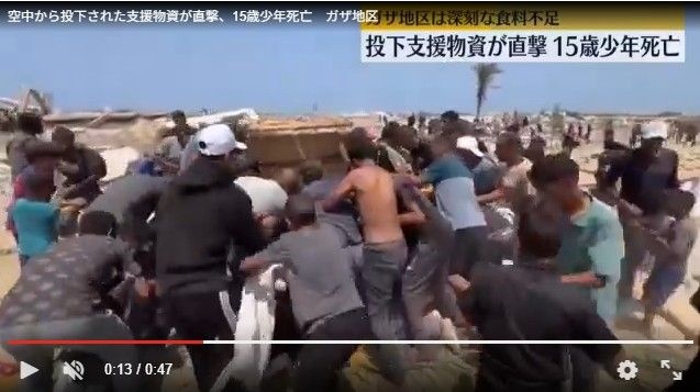 空中から投下された支援物資が直撃、15歳少年死亡 ガザ地区(日テレNEWS NNN) - Yahoo!ニュース食料不足が深刻化するパレスチナ自治区のガザ地区で9日、空中から投下された支援物資が15歳の少年を直撃し、この少年は死亡しました。 ガザ地区中部で9日、パラシュートで投下された支援物資が15歳の少年news.yahoo.co.jp - 3 : 2025/08/10(日) 15:10:54.29 ID:vODzJxY70