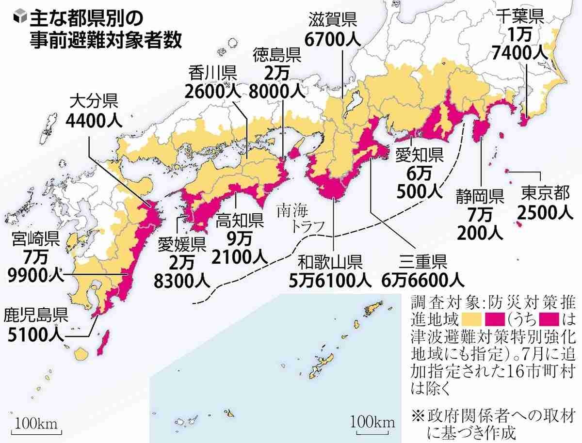 昨年8月8日に宮崎県沖の日向灘で起きた地震に伴い「注意」が初めて出されたことなどを受け、政府は今年6~8月、国が「防災対策推進地域」に指定する29都府県707市町村(5月時点)を対象に、事前避難の指定状況を調べた。