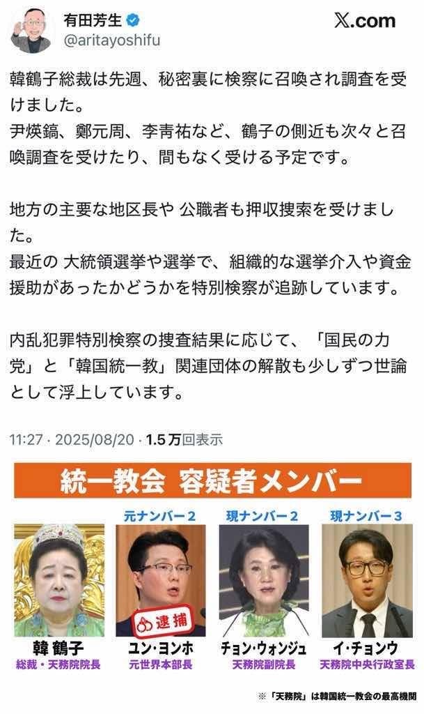 韓鶴子 検察に召喚され取り調べwww