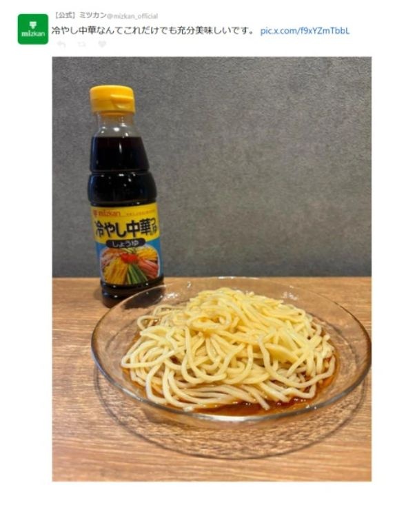 そのさなか、ミツカンは「冷やし中華なんてこれだけでも十分美味しいです」と、麺に自社商品のつゆをかけたシンプルな調理法の写真をアップしてPR。