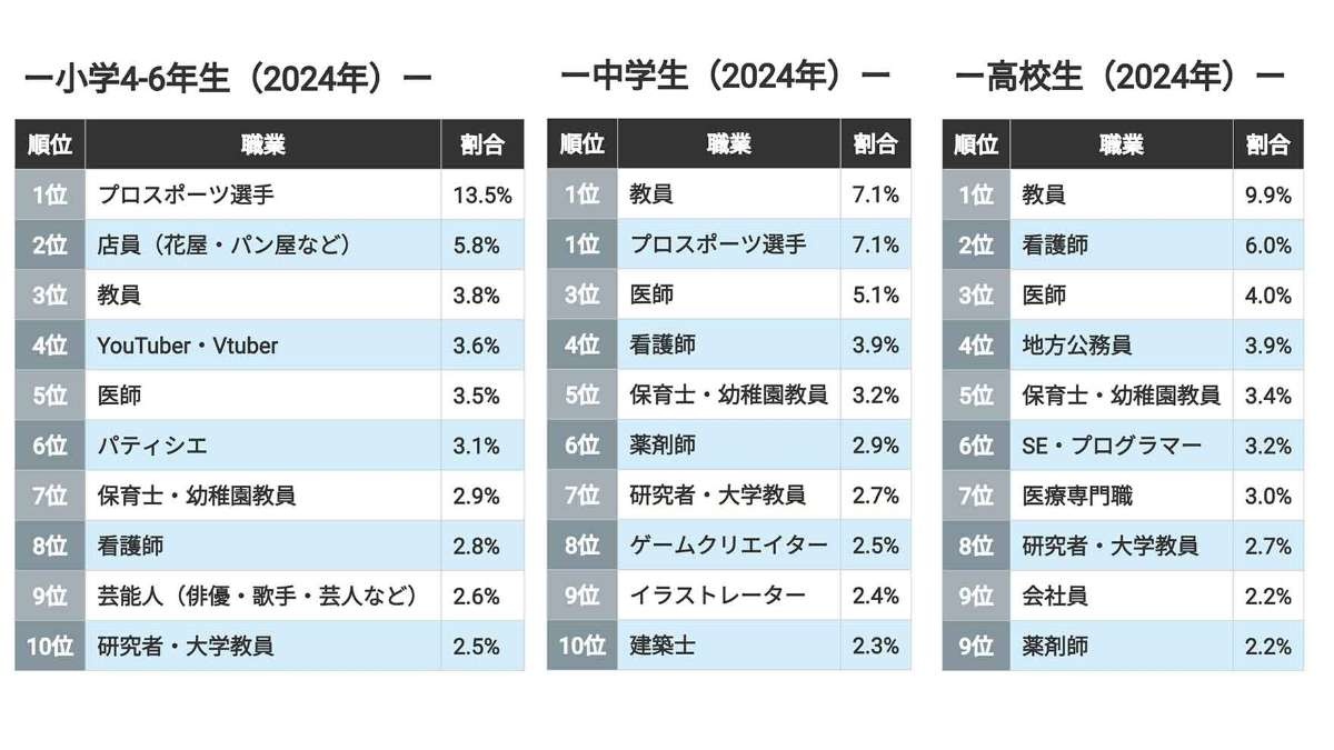「子どもの生活と学びに関する親子調査 2024」の、子どもたちのなりたい職業ランキングでは、小学4~6年生では「プロスポーツ選手」、中学生は「教員」と「プロスポーツ選手」、高校生は「教員」が1位となった。東洋経済education × ICT編集部