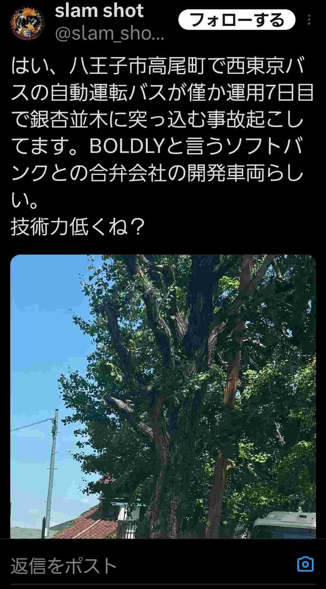 八王子市高尾町で西東京バスの自動運転バスが僅か運用7日目で銀杏並木に突っ込む事故起こしてます。