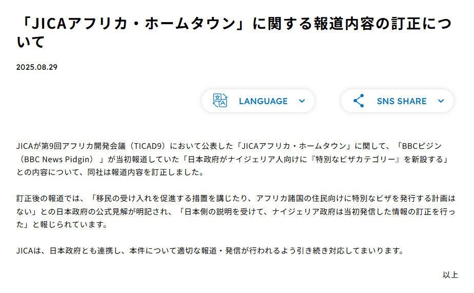 JICAはこのほど「JICAが第9回アフリカ開発会議(TICAD9)において公表した『JICAアフリカ・ホームタウン』に関して、「BBCピジン(BBC News Pidgin)」が当初報道していた『日本政府がナイジェリア人向けに『特別なビザカテゴリー』を新設する』との内容について、同社は報道内容を訂正しました」と告知。「訂正後の報道では、『移民の受け入れを促進する措置を講じたり、アフリカ諸国の住民向けに特別なビザを発行する計画はない』との日本政府の公式見解が明記され、『日本側の説明を受けて、ナイジェリア政府は当初発信した情報の訂正を行った』と報じられています」と伝えた。