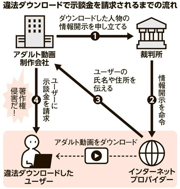 ファイル共有ソフト「ビットトレント」を使ってアダルト動画を違法にダウンロードしたユーザーを特定するために、動画の制作会社が「発信者情報開示」の申し立てを裁判所にするケースが相次いでいる。制作会社は、身元がわかったユーザーに示談金を請求しているが、金額が相場よりかなり高額な場合がある。識者は「示談の条件に注意してほしい」と指摘する。