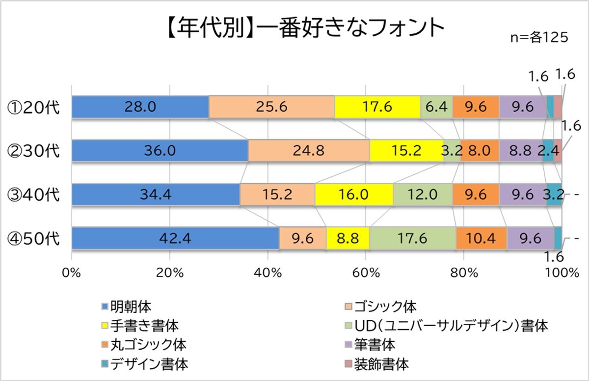 男女別で見ると、上位3位は男女ともに全体と同じだが、4位は男性が「筆書体」(11.2%)、女性が「丸ゴシック体」(12.8%)。年代別で見ると、1位は「明朝体」だが、2位は20代、30代が「ゴシック体」(20代:25.6%、30代:24.8%)、40代が「手書き書体」(16.0%)、50代が「UD書体」(17.6%)と年代によって好みが分かれる結果となった。