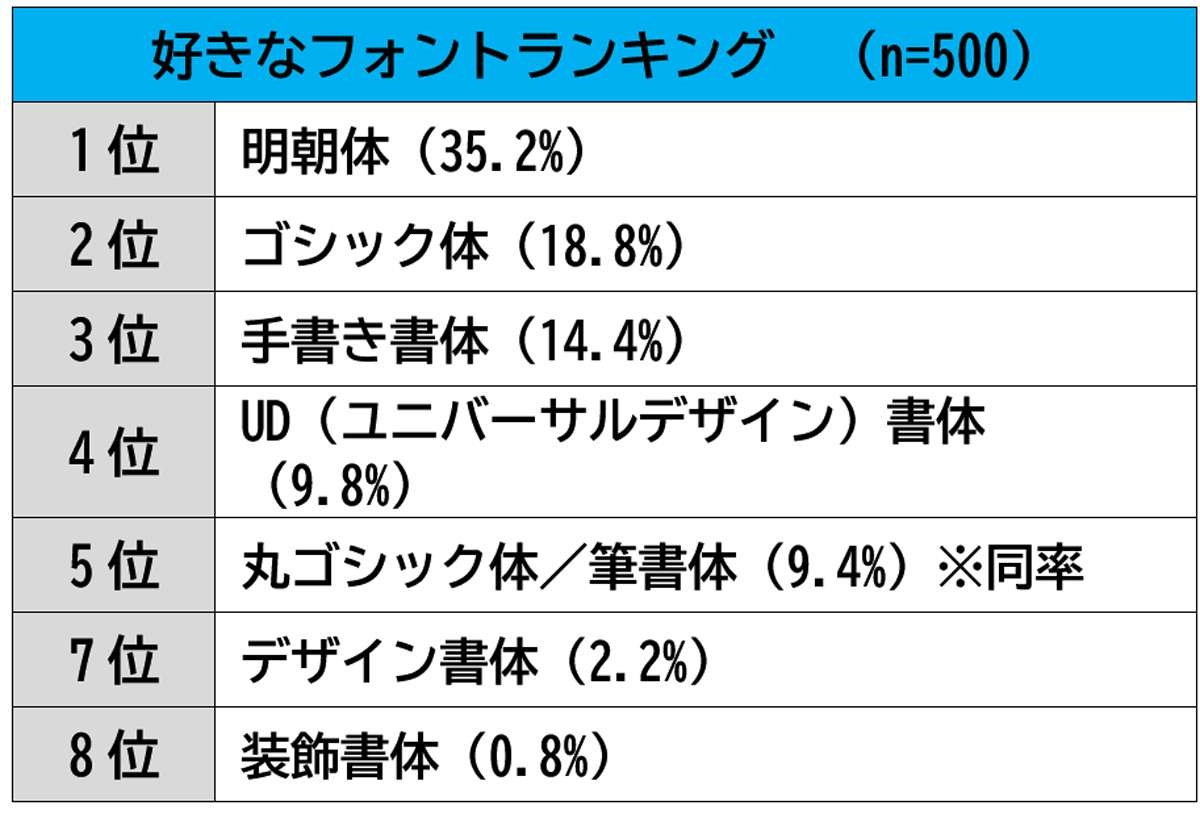 好きなフォント1位は「明朝体」(35.2%)で、2位「ゴシック体」(18.8%)、3位「手書き書体」(14.4%)と続いた。「明朝体」が好きな理由は「最も見慣れているから」「一番見やすく無難」「上品で誠実なイメージがあるから」だった。