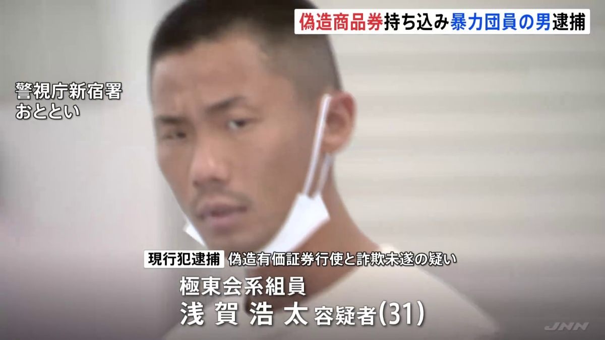 偽造商品券100枚をチケットショップへ…金だまし取ろうとした疑いで暴力団組員の31歳男を逮捕 東京・新宿区