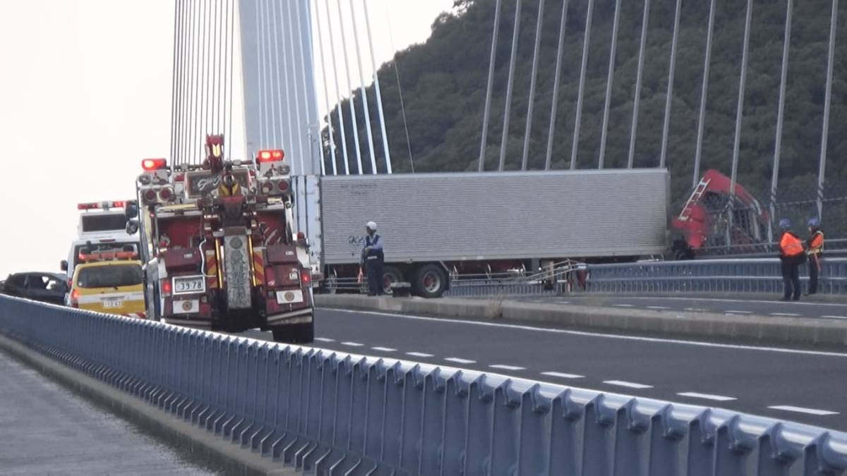 13日未明、長崎市の女神大橋で、大型トレーラーと乗用車が衝突する事故があり、トレーラーのフロントガラスが割れ、運転手の行方が分からなくなっています。