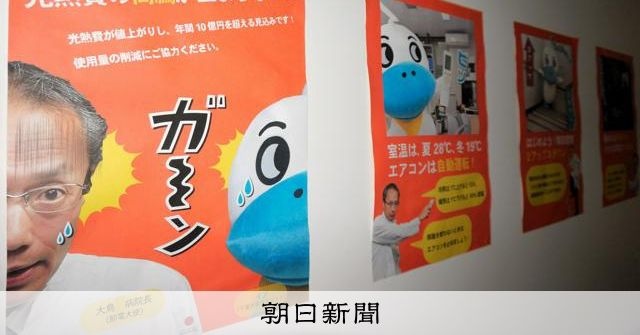 国立大学法人の千葉大医学部付属病院の暗い廊下の壁にポスターが並んでいる。大鳥精司院長が年間10億円の電気代に驚く構成を通じて、節電を呼びかける内容だ。