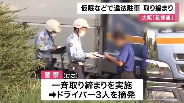 22日朝、大阪市鶴見区の「花博通」で、仮眠などで長時間路上駐車するトラックの一斉取り締まりが行われました。