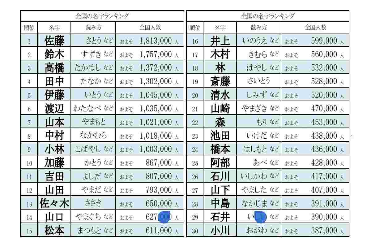 2025年の全国名字ランキング、1位は「佐藤」さんで、全国人数はおよそ181万3,000人。以下、2位「鈴木」さん(全国人数175万7,000人)、3位「高橋」さん(同137万2.000人)、4位「田中」さん(同130万2,000人)、5位「伊藤」さん(同104万5,000人)と続き、ベスト30である「小川」さん(同38万7,000人)までの全国人数の合計はおよそ2,267万7,000人。この数値は、日本の総人口1億2,433万690人(令和7年1月1日総務省統計局調べ)の約18%に相当する。