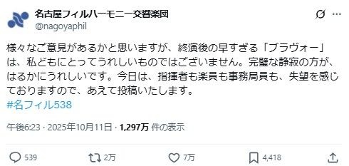 https://www.nikkansports.com/entertainment/news/202510120000254.html愛知県を拠点とするプロオーケストラ「名古屋フィルハーモニー交響楽団」の公式X(旧ツイッター)が11日、更新され、終演後、早すぎるタイミングでの「ブラヴォー」のかけ声に対する注意喚起がなされた。投稿は12日昼時点で1274万回を超える表示回数となり、500以上のコメントが集まる反響となっている。