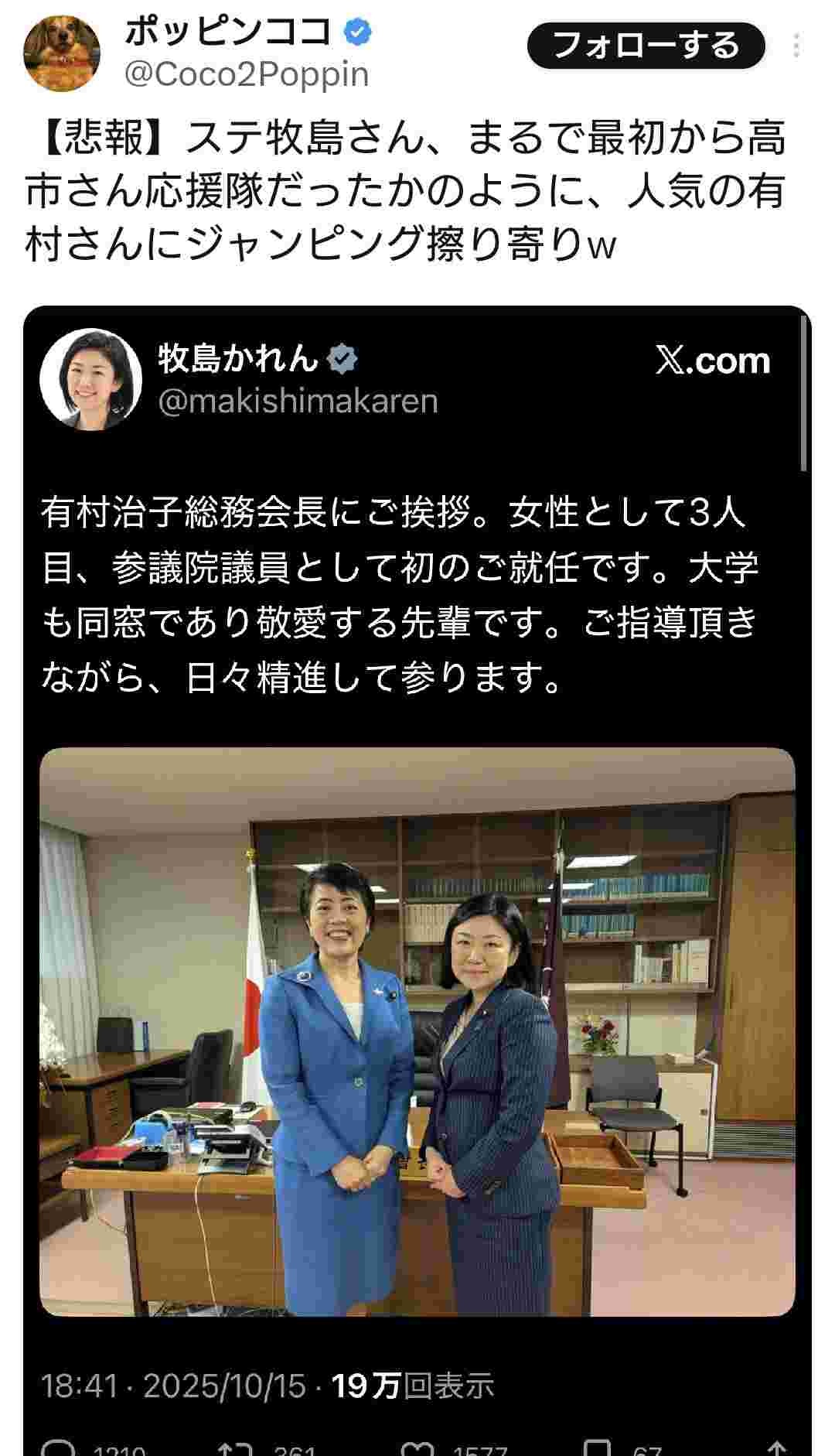 ステ牧島さん、まるで最初から高市さん応援隊だったかのように、人気の有村さんに擦り寄り