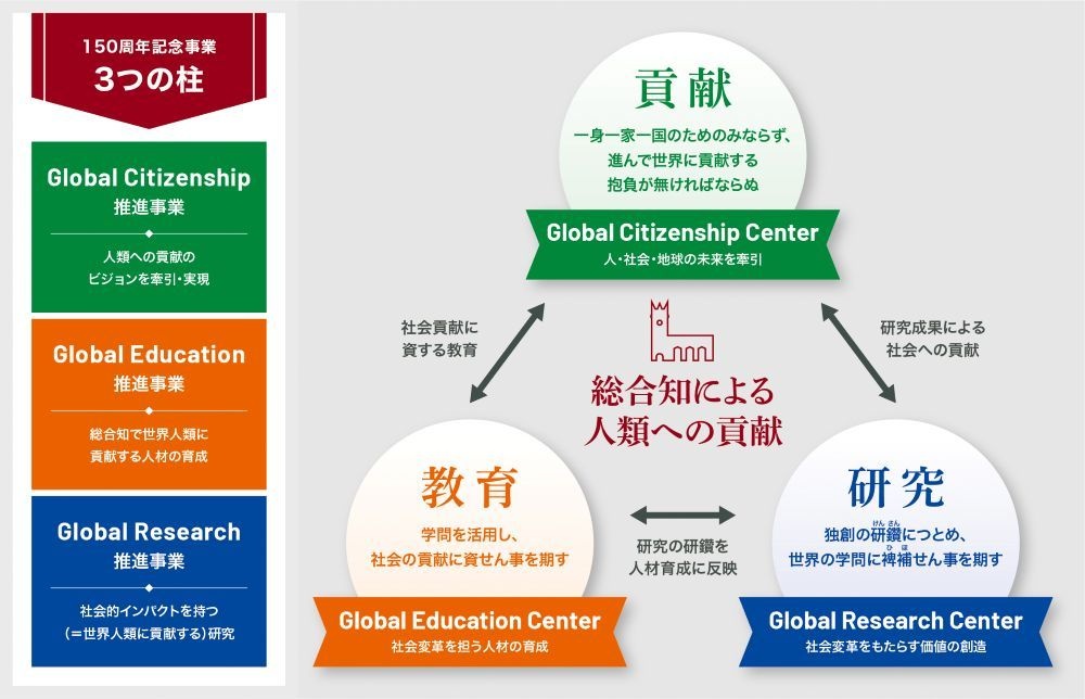 2032年までのビジョンは鎌田薫前総長がすでに描いており、ここで挙げた目標は8割ほど達成しています。そこで、2050年のあるべき姿を見据え、大学として大きく羽ばたくための「ジャンプ台」をつくることが、創立150周年における私たちのミッションだと考えています。目指しているのは、「世界人類に貢献する大学」です。