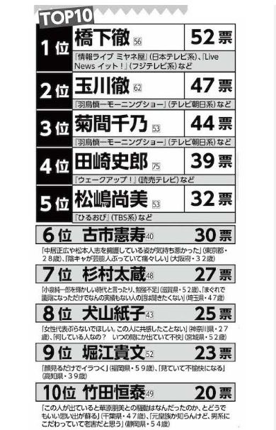 そこで今、女性視聴者が「見たくない」と思っている文化人コメンテーターは誰なのか。1000人の女性にアンケートをとったところ……。