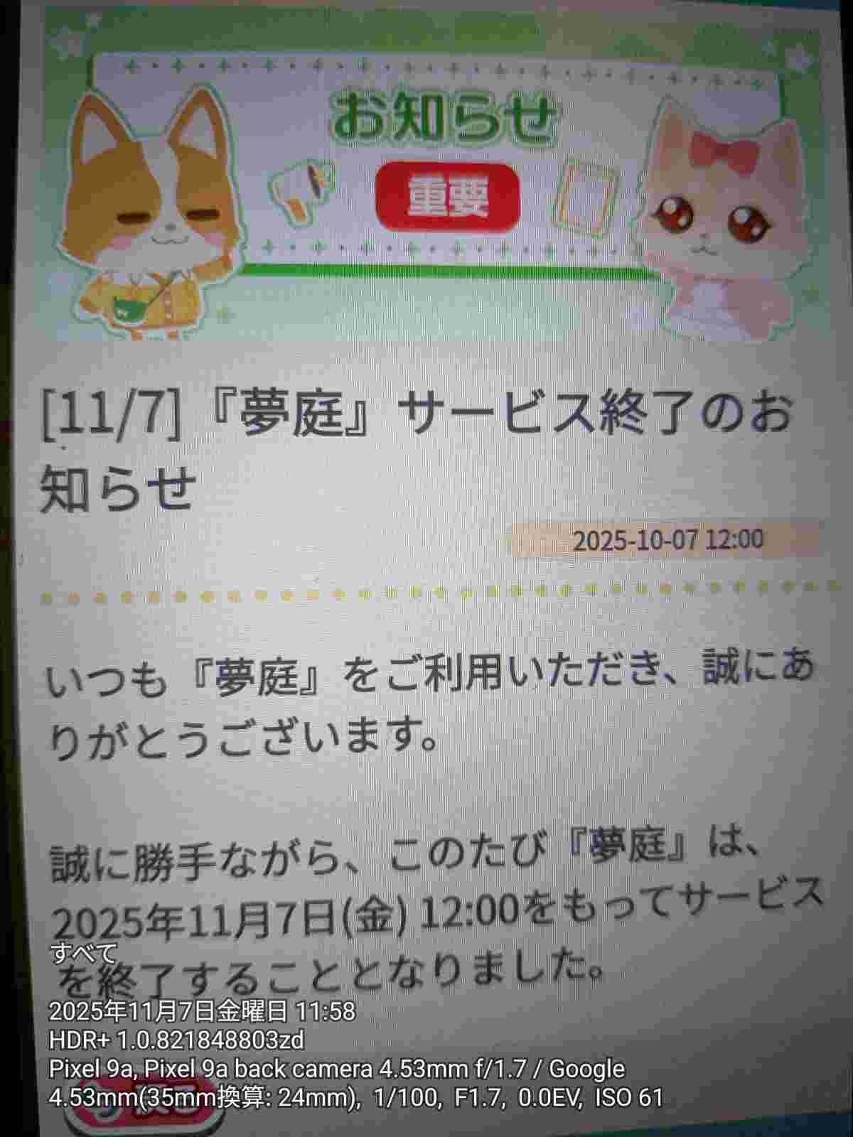 サービス終了のお知らせ – 夢庭yumeniwa.jp - 2 : 2025/11/07(金) 12:02:07.30 ID:1gsk0AEa0