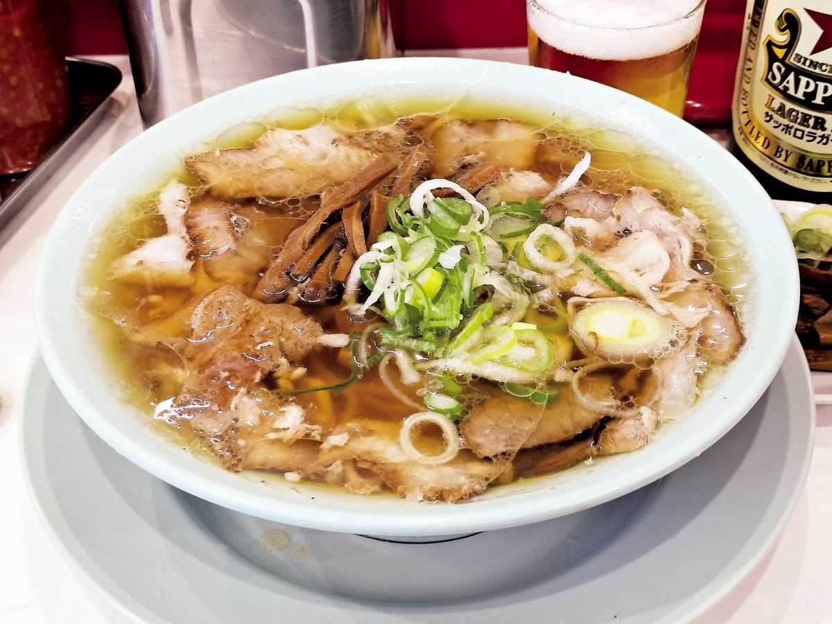 スープは、チャーシューとなる豚肉を炊いたゆで汁を醤油だれで仕上げたシンプルなものにふわっとした食感の平打ち麺という、ごく普通なもの。
