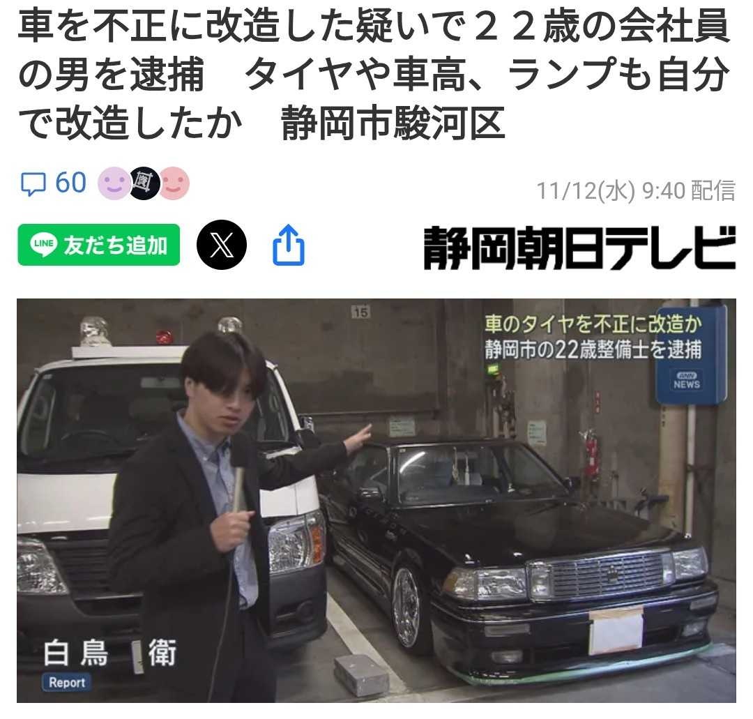 車を不正に改造した疑いで22歳の会社員の男を逮捕 タイヤや車高、ランプも自分で改造したか 静岡市駿河区