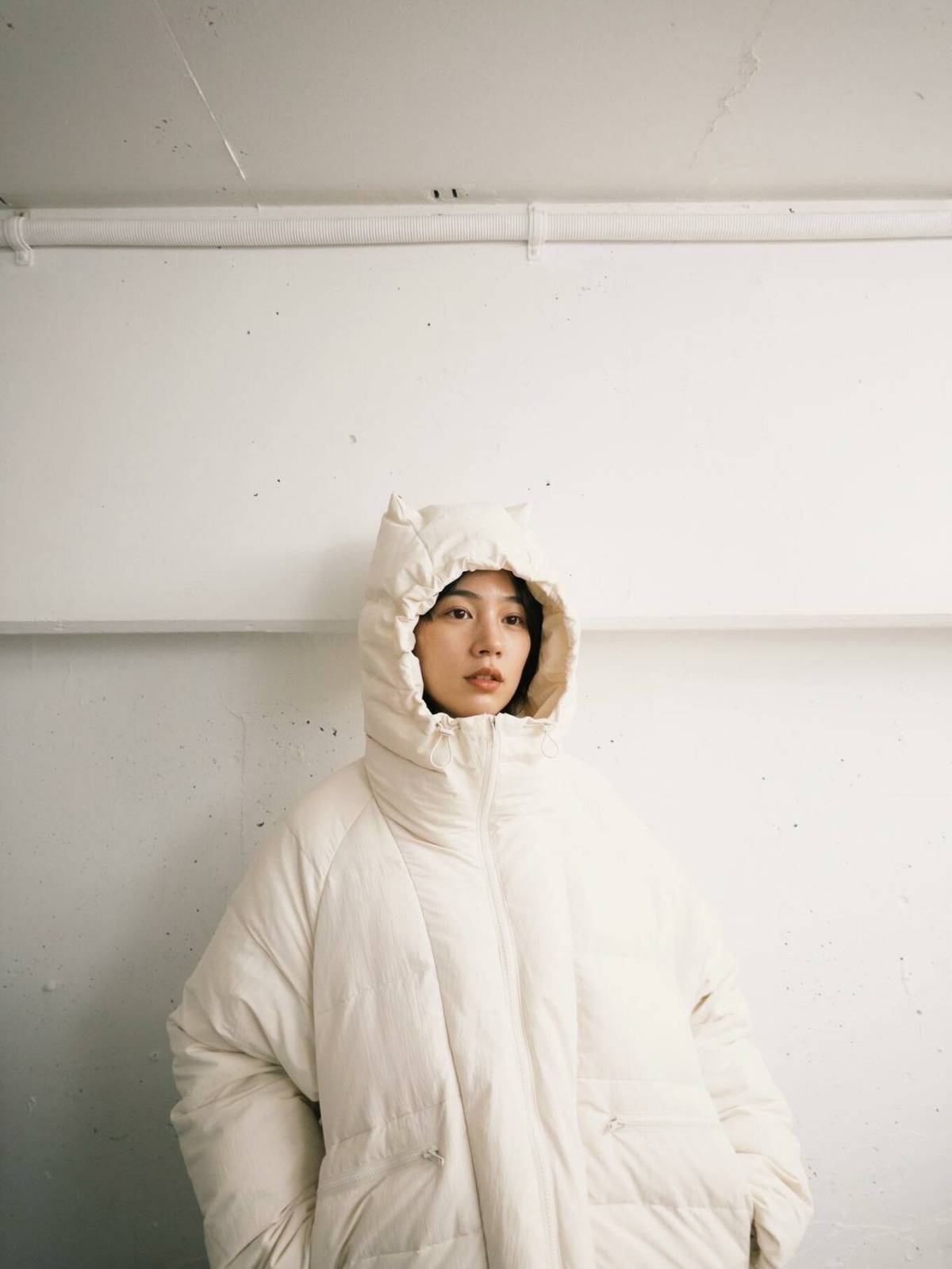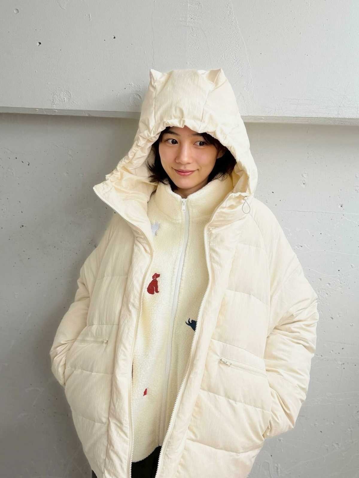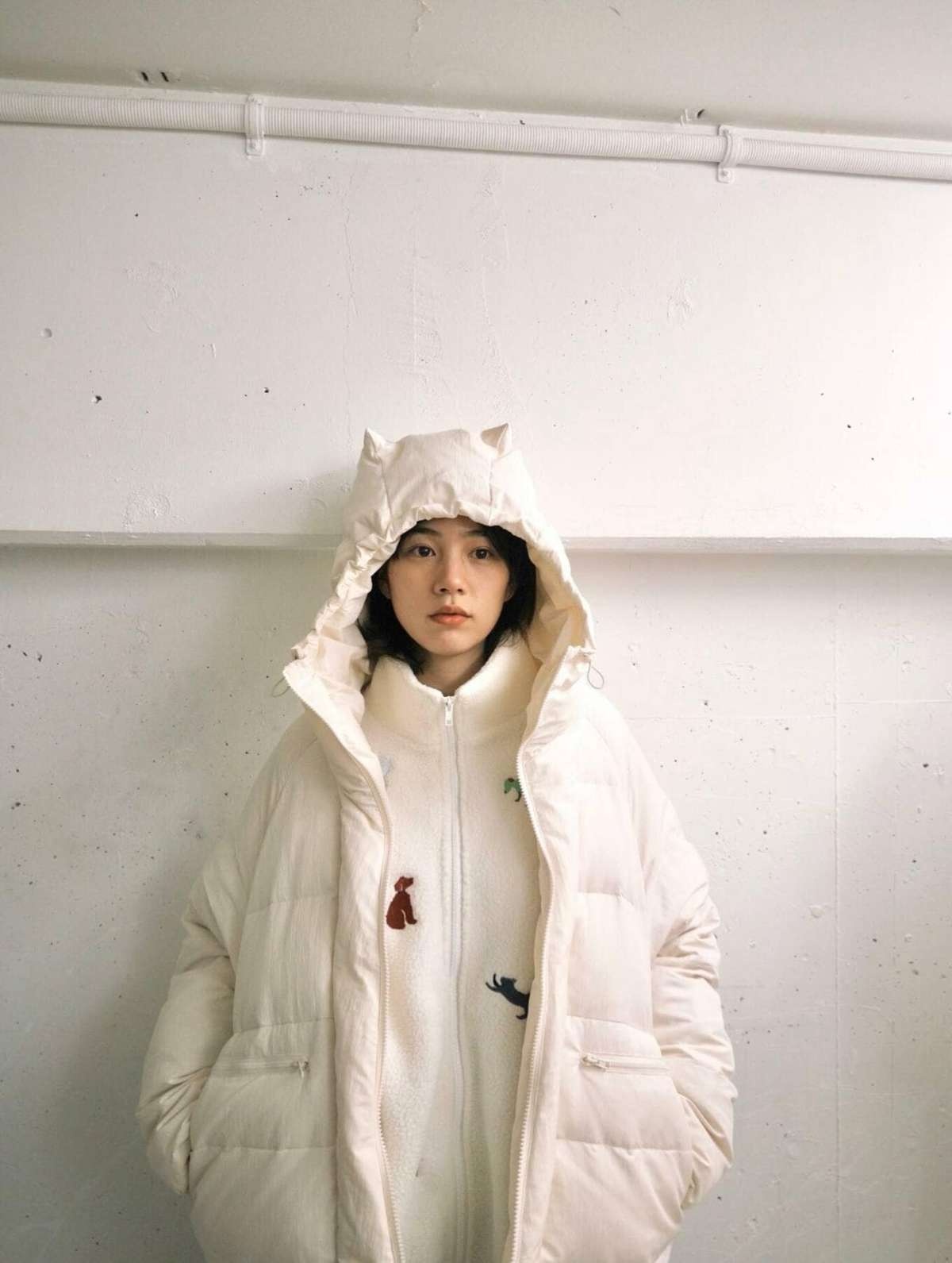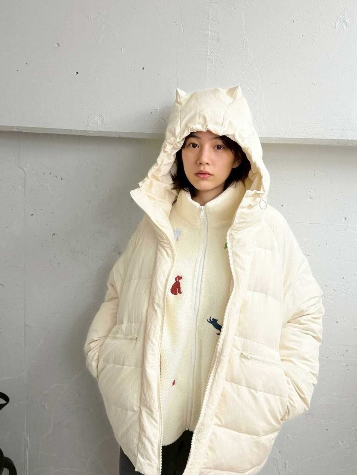 ダウンのフード部分は「猫耳」の様なフォルムをしています。内側には同系色のセーターを着用し、胸元には赤と青の刺繍がさりげないアクセントになっています。柔らかな微笑みを浮かべている表情からは、穏やかな雰囲気が伝わってきます。