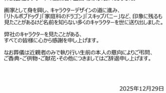 芸スポ 【訃報】サンワード創業者・上田修さん、死去 「リトルボブドッグ」「家庭科のドラゴン」「スキップバニー」生みの親