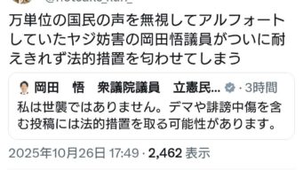 ニュー速 立憲のヤジ岡田さん「デマや誹謗中傷を含む投稿には法的措置を取る可能性があります」