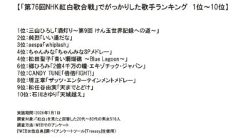 芸スポ 第76回NHK紅白歌合戦』で がっかりした歌手ランキング…3位aespa、2位 純烈 を抑えた1位は?